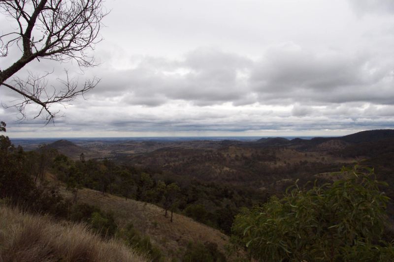 We departed Wollongbar around 7am. My brother and his wife decided to join me and dad for the first day of the trip. The sky was very discouraging, with a very strong SE blowing, drizzle, and 8/8 cloud cover when we left. After a week of storms before leaving, the SE winds were back, which was not good for storm chances. We headed for S QLD where AVN had forecast LIs down to -4 and CAPE around 800. We took a path from Wollongbar - South Brisbane - Toowoomba - Dalby. Throughout the trip we were met with SE winds and 8/8 cloud cover. It was quite cool. At Dalby I decided it wasn't worth heading any further north, as storms were unlikely in any area we could reach so we decided to do a bit of bushwalking. The view from near the top on the Bunyan Mountains was rather nice.