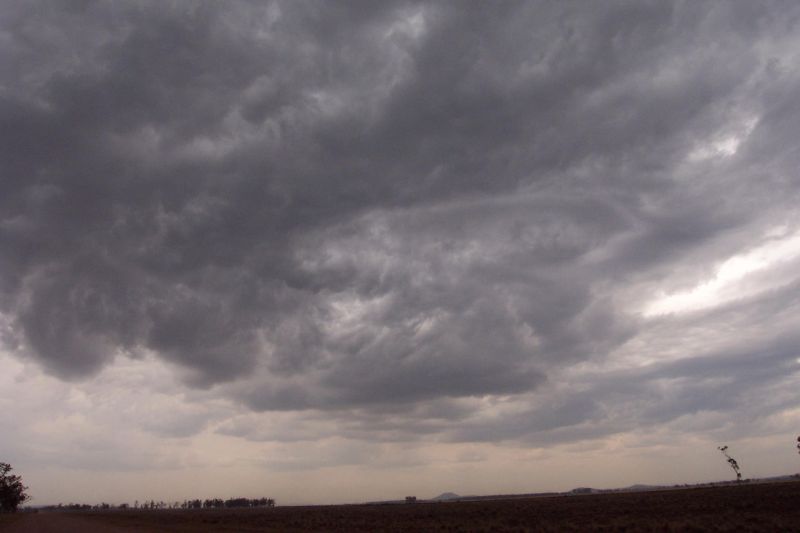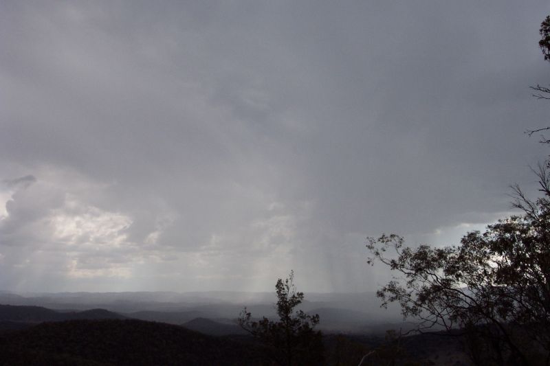Once again we awoke to almost completely overcast skies. Anthony called and we decided to meet up at Gunnedah, about an hours drive ENE from where we were. What was scary was that when we were travelling we experienced the driest, deadest land of the whole trip. It was just depressing, dead animals in the paddocks and no grass anywhere. We met up at 10.30am at Maccas and went to Porcupine lookout, which had good views of the east and west. There was still 8/8 cloud cover and we sat around, playing a little bit of frisbee and throwing ice onto the roof till deciding to go get some lunch from town and check the net. There was only a tiny bit of flat Cu around. Sadly we couldn't get a PC at the library to use the net, so we had lunch and headed back to the lookout. When we got there the cloud had thinned out somewhat to the west and already Cjs started popping up over the ranges which had sunlight on them. Soon after we decided to chase some alright looking congestus near Coonabarabran. We eventually found ourselves in the heavy rain under the cell, and soon enough CGs started punching around nearby, picked up on the CB radio as well. After some fun driving through the rain we headed back out of the cell and around to it's southern side to watch it.