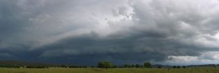 What had been thwarting our attempts for good photos so far was that the sun was still shining between us and the storm! All of a sudden the sun was pushed behind the advancing storm. I didn't think to look where it had just been blocked until I heard some loud swearing from Anthony (a rare event!) commanding us to look to our right! And what a sight it was! The complete structure had become visible - a multi layered gustfront, which looked suspiciously like a mothership mesocyclone! Where previously there was a good hint of an inflow band coming in from the east, it now looked like a full blooded multi level inflow highway!