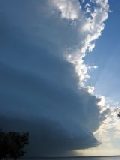 Picking up the 3pm observations at Rainbow Bay, I yelped when I saw the air temp was of 30 with a dewpoint of 26! It certainly was a very humid day, but if it really was 26 it was going to make for some lovely base features as the storm reached the coast! We all could easily see that the anvil was getting stronger by the minute, and this storm was really kicking into the top gears! I got some *very* occasional glimpses of the base features, and from the sounds I was making when describing the banding-like features that I could see, we all got quite excited by the time we arrived at Rainbow Beach!